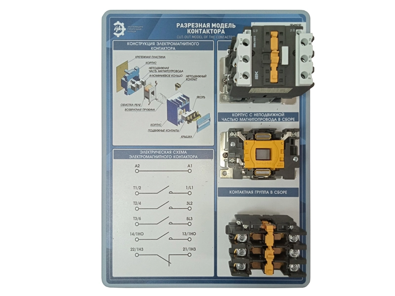 Планшет "Контактор" представляет собой основание, на котором закреплены контактор в сборе, корпус с неподвижной частью магнитопровода, контактная группа. Для наглядности на основании имеются полноцветное изображение конструкции и электрическая схема электромагнитного контактора, демонстрирующие принцип работы электрического контактора.
